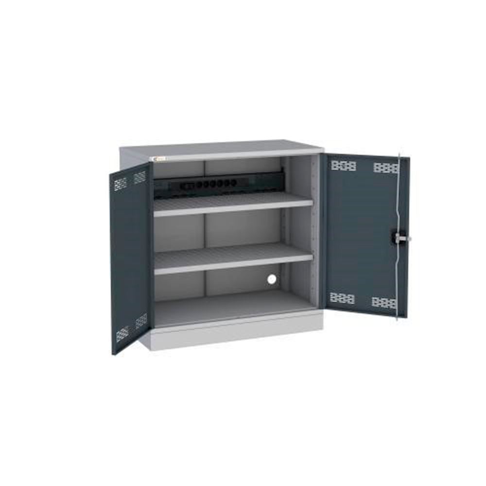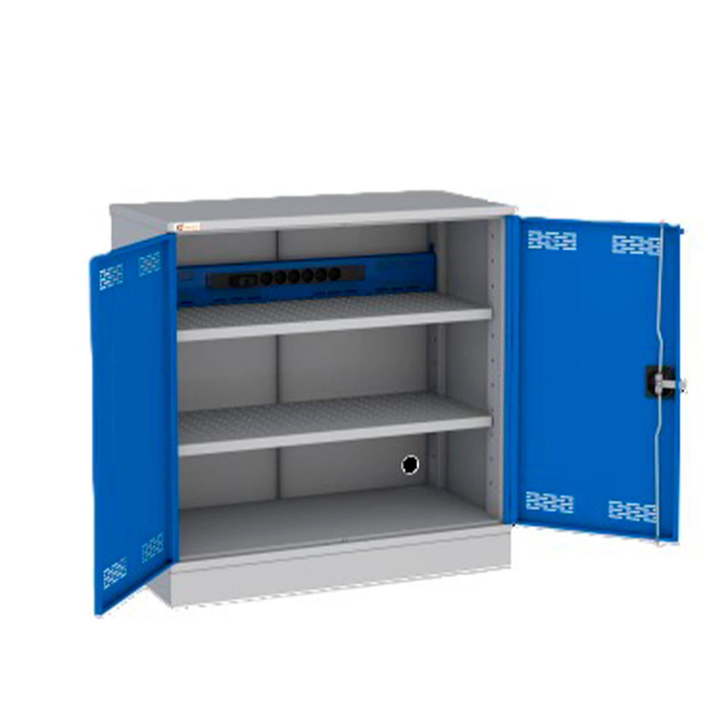 Внутренняя часть этого шкафа состоит из двух полок и одной электропанелели и позволяет иметь в своем распоряжении источник питания для зарядки аккумуляторного оборудования, будь то электроинструмент или электроника. Полки и двери имеют перфорацию для свободной циркуляции воздуха и предотвращают перегрев оборудования во время зарядки. Трехточечный ключевой замок защищает от несанкционированного доступа. Шкаф соответствует ГОСТ 58864-2020, срок службы не менее 5 лет, гарантия завода-изготовителя 12 мес.