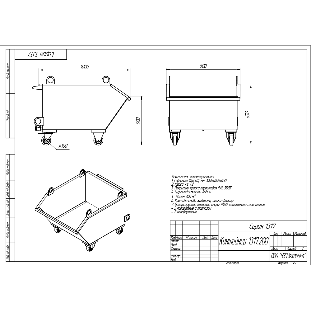 - Колеса диаметром 100 мм – 4 шт. 2 поворотных с тормозом, 2 неповоротных.