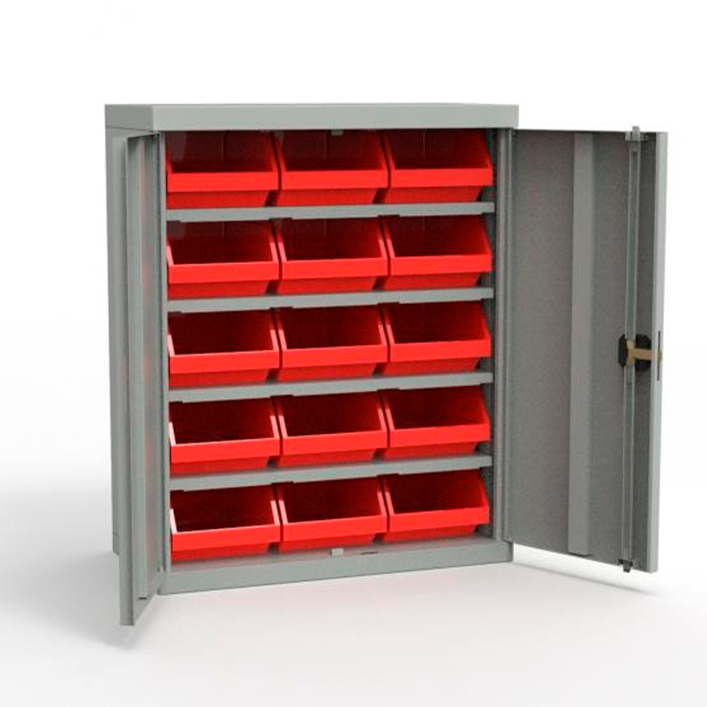 - Тумба для метизов ЗС-Д.5003.15 с дверцами без ящиков – 1 шт. Пять ярусов хранения на 15 ящиков. Четыре полки . Дно полок усилено профилем, нагрузка на полку – 80 кг. Конструкцией полок предусмотрена фиксация контейнера в наклонном положении. Двери с 1 ригельным замком арт. F-90, в комплекте 2 ключа. Петли дверей скрытые, осевого типа. Предусмотрены отверстия для крепления шкафа к стене (при необходимости). Опоры (ножки), металлические М10, регулируются по высоте.