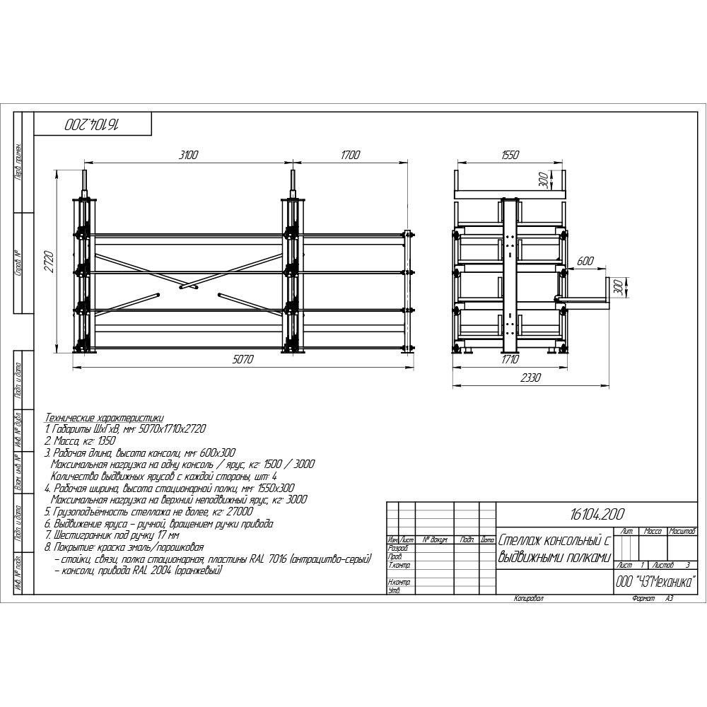 - Максимальная нагрузка на выдвижную полку (ярус) – 3 000 кг.