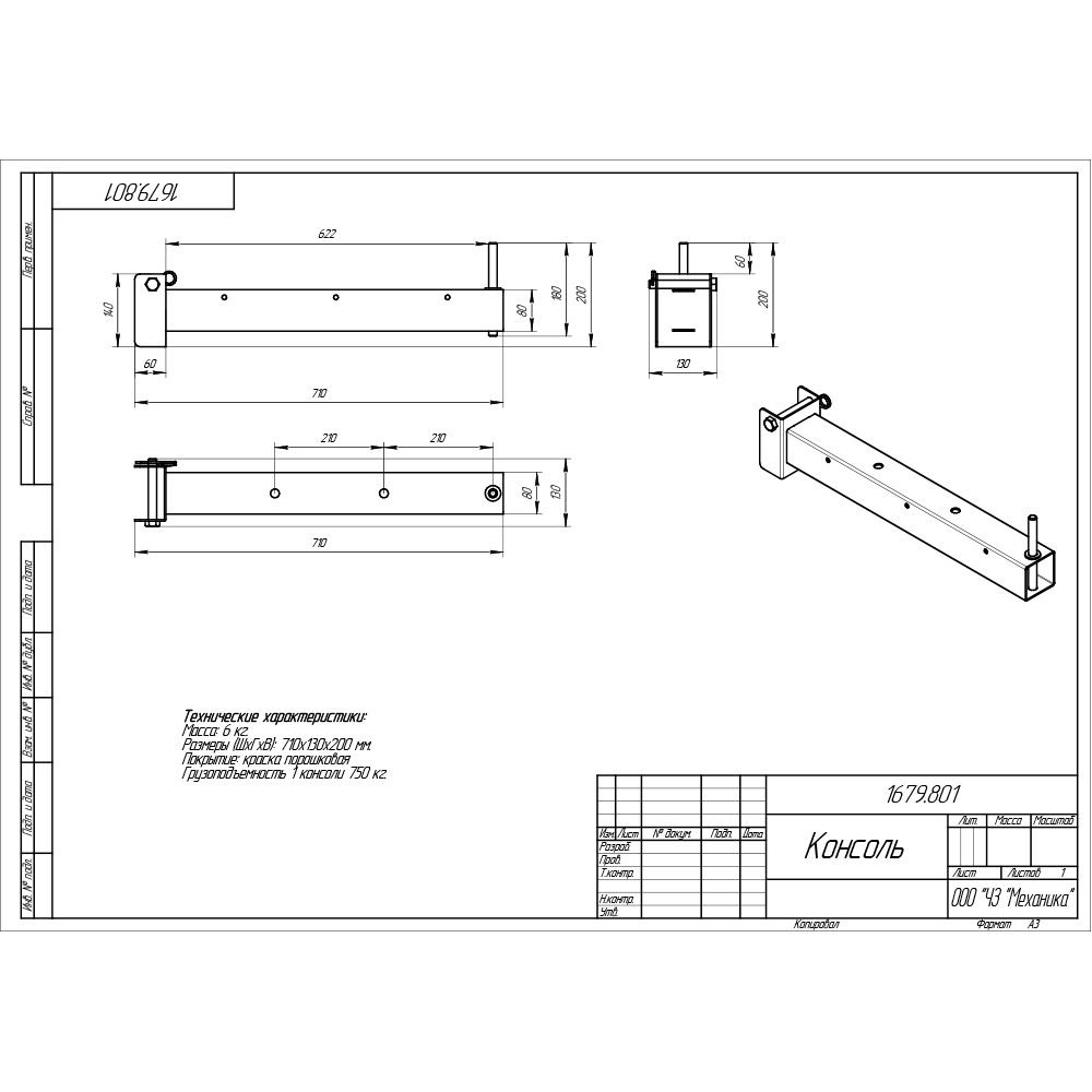 - Консоль с фиксатором – 1 шт. Глубина консоли рабочая 600 мм. Шаг регулировки консолей по высоте на стойке 100 мм. Нагрузка на консолей 750 кг.