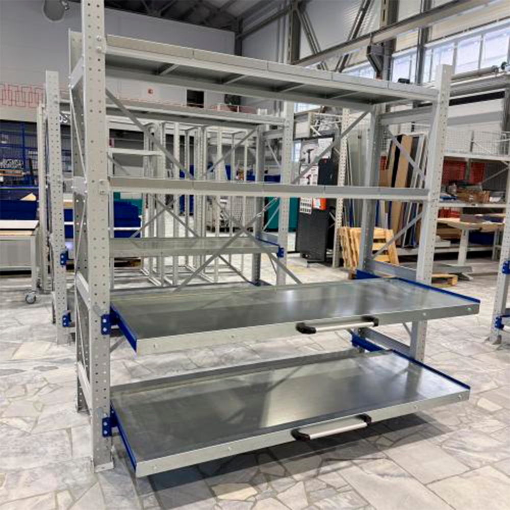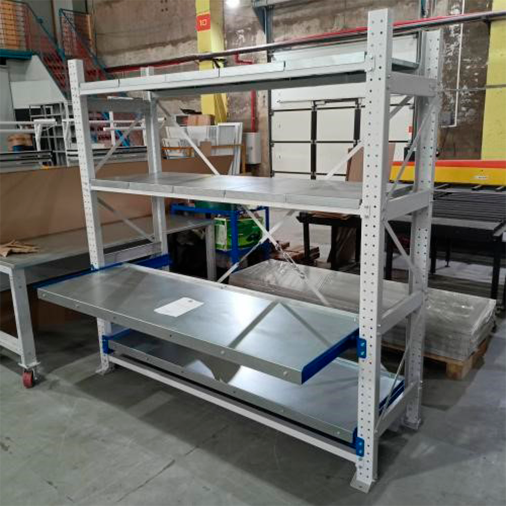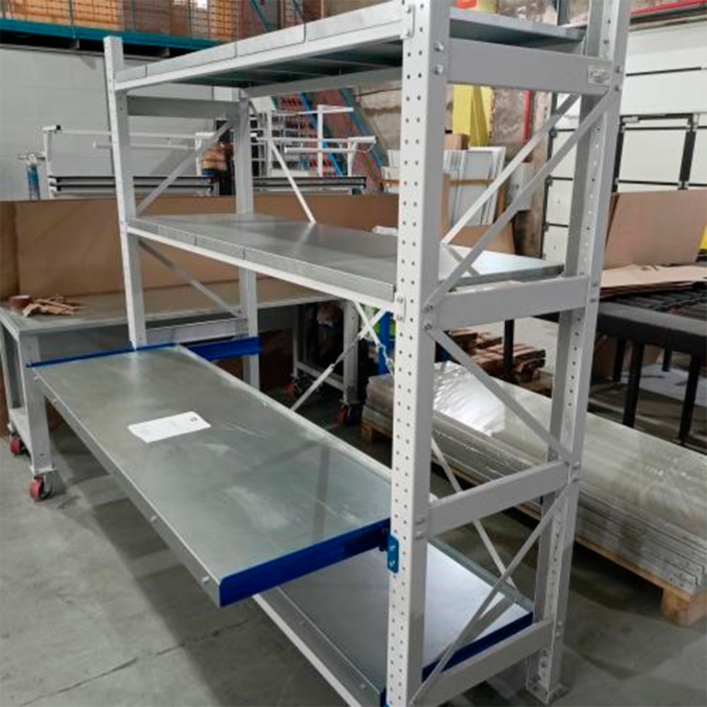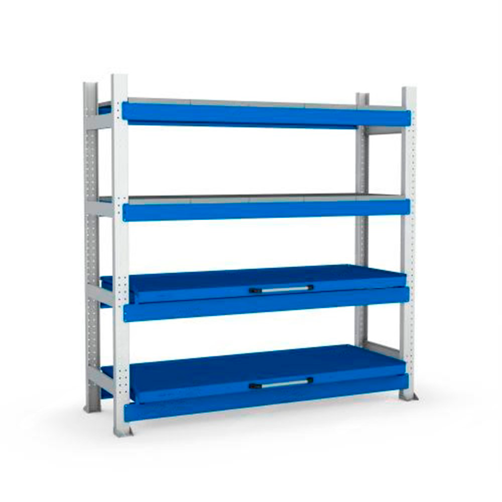 Стеллаж складской с выкатными платформами. Односекционный стеллаж 4-и уровня хранения. Выдвижение платформ 80 %.