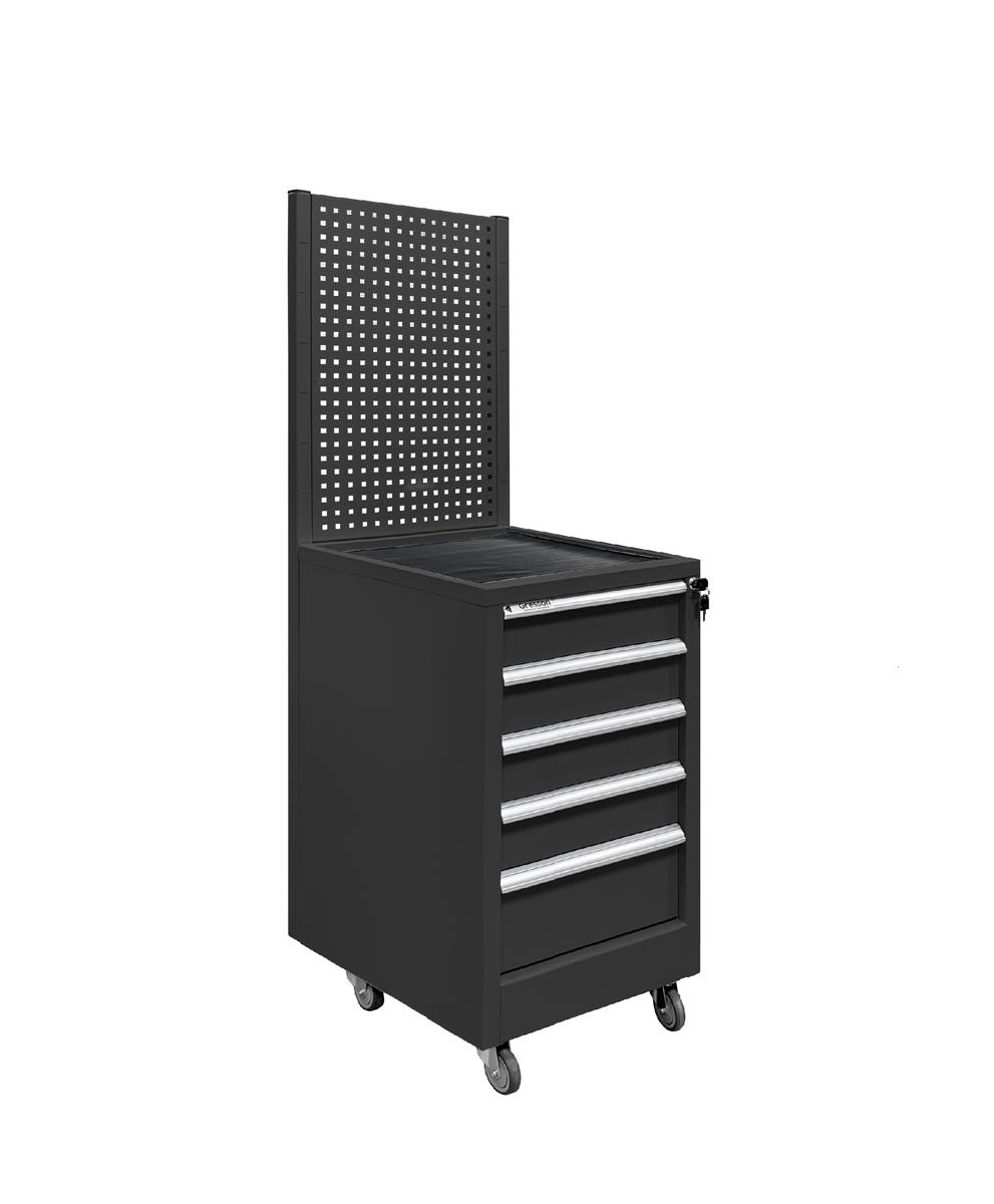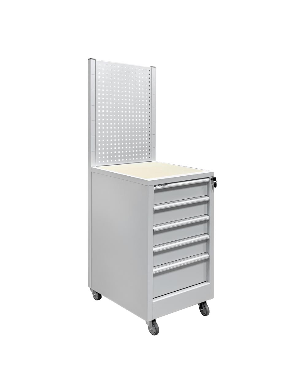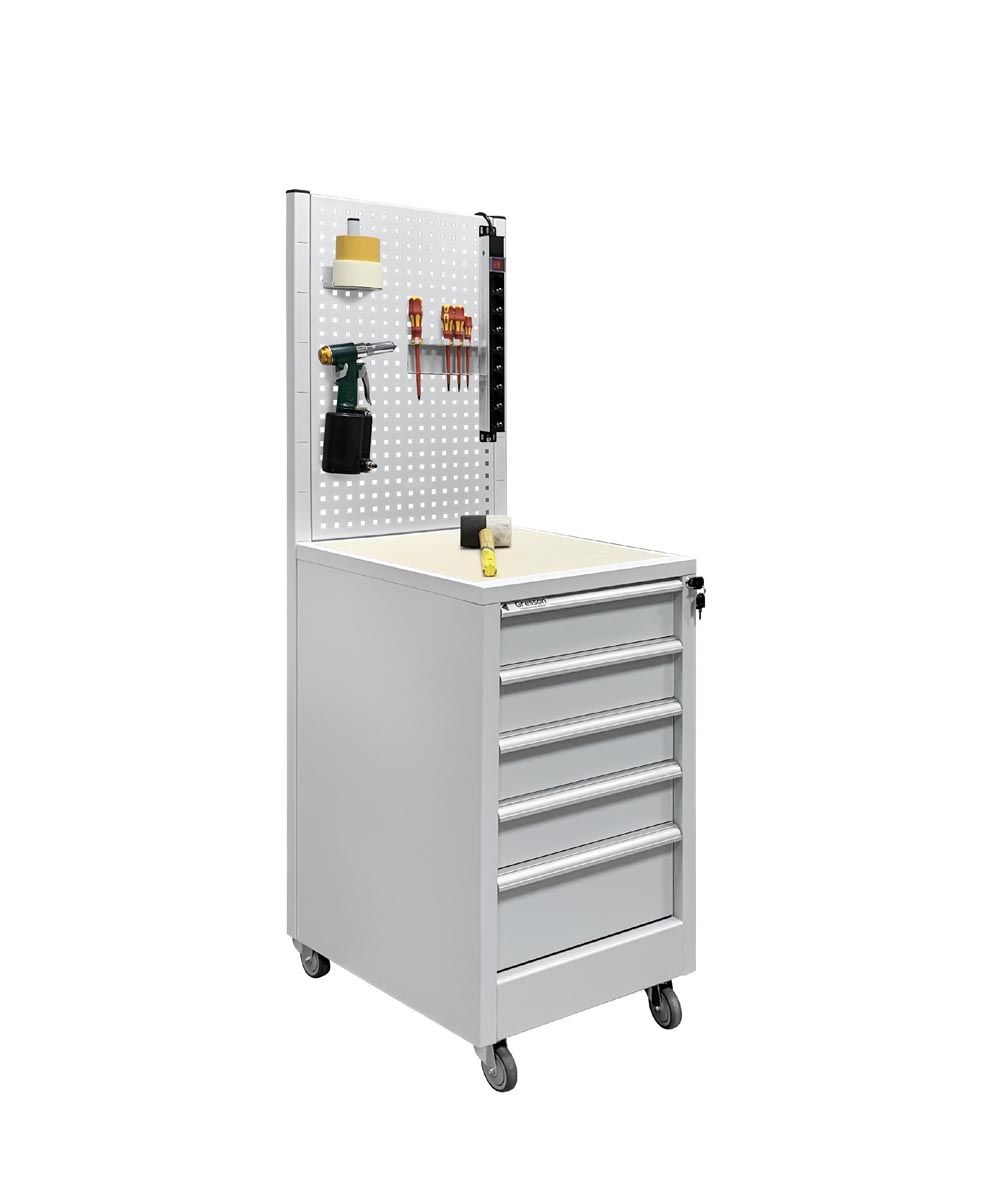 Стойка оснащена центральным замком для индивидуального доступа. Каркас и ящики изготовлены из листового металла для увеличения эксплуатационного ресурса и повышения надежности. Ящики защищают рабочие материалы, инструменты от загрязнения и сохраняют их в исходном состоянии. Ручки изготовлены из алюминиевого профиля с анодированным покрытием и боковыми пазами для установки обозначения (маркировки) ящиков по их прямому назначению (подразделение организации, документация, инструменты, материалы и т.д.).
