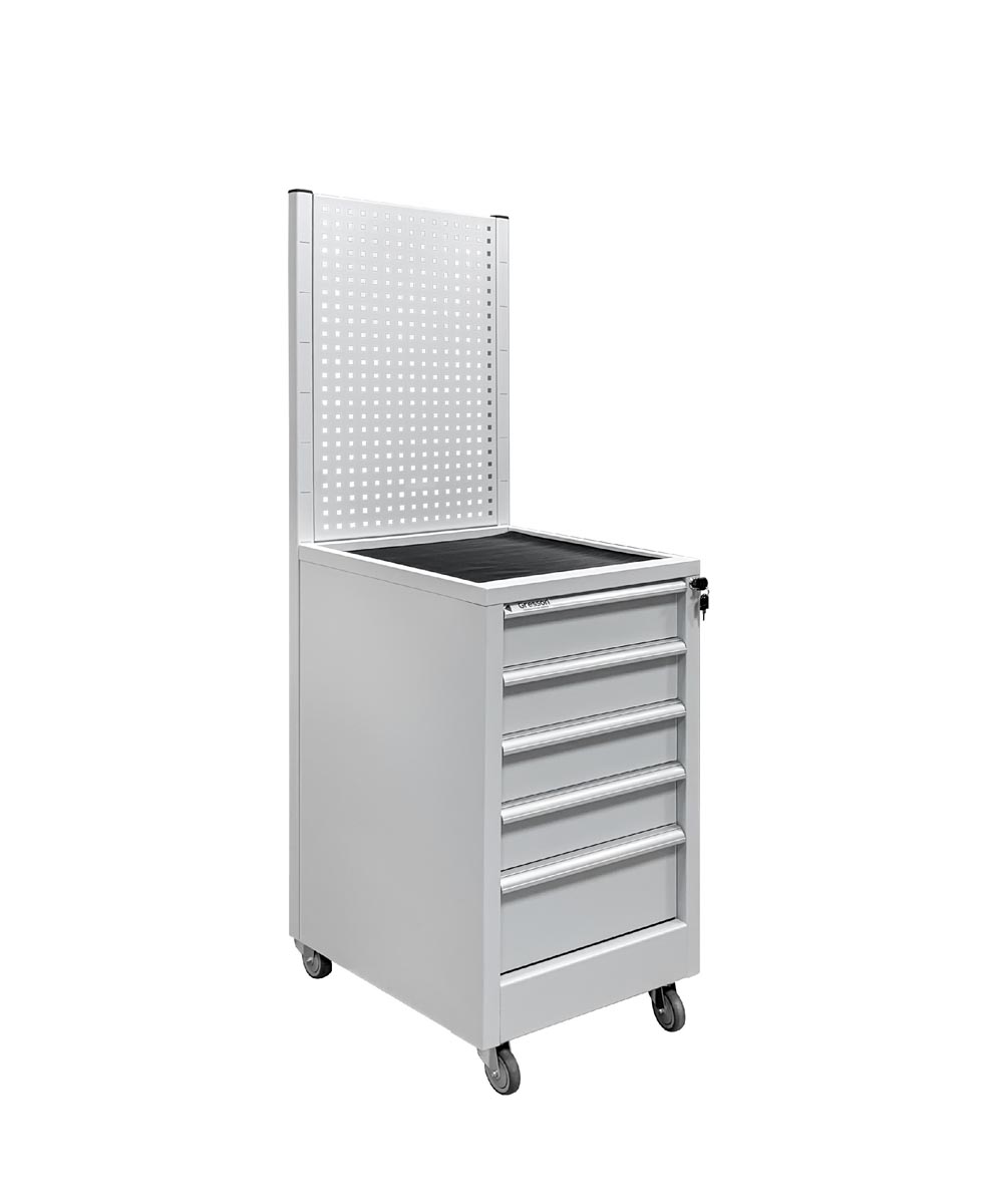 Стойка оснащена центральным замком для индивидуального доступа. Каркас и ящики изготовлены из листового металла для увеличения эксплуатационного ресурса и повышения надежности. Ящики защищают рабочие материалы, инструменты от загрязнения и сохраняют их в исходном состоянии. Ручки изготовлены из алюминиевого профиля с анодированным покрытием и боковыми пазами для установки обозначения (маркировки) ящиков по их прямому назначению (подразделение организации, документация, инструменты, материалы и т.д.).