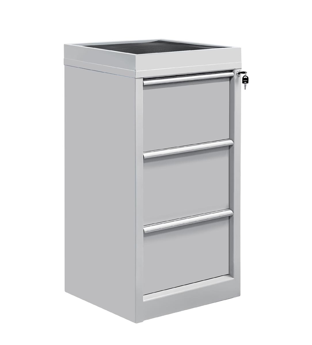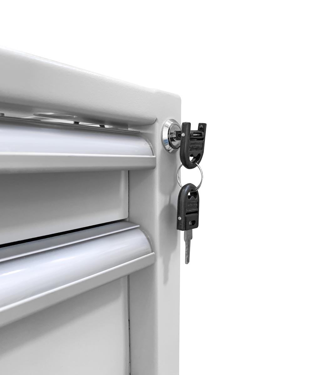 Стационарные тумбы оборудованы центральным замком для индивидуального доступа. Каркас и ящики изготовлены из листового металла для увеличения эксплуатационного ресурса и повышения надежности. Ручки изготовлены из алюминиевого профиля с анодированным покрытием и боковыми пазами для установки обозначения (маркировки) ящиков по их прямому назначению (подразделение организации, документация, инструменты, материалы и т.д.).