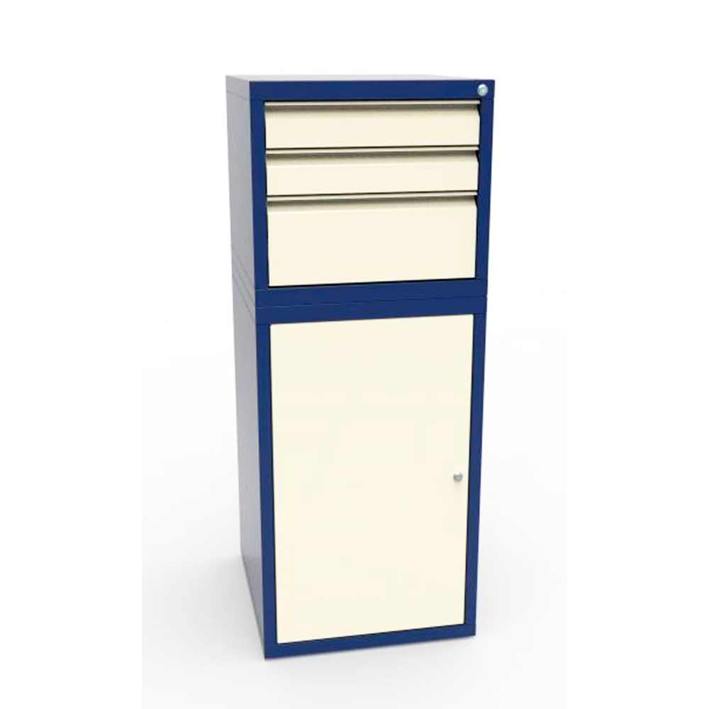 Инструментальные тумбы серии Святогор изготовлены из листовой х/к стали толщиной 0,9мм. Порошковое покрытие корпус RAL 5002 (синий) дверца и полка RAL 7032 (св.серый). Для компенсации неровностей пола имеются регулируемые по высоте опоры (ножки) М 10.