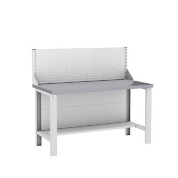 Верстак слесарный бестумбовый. Верстак слесарный Flames серии ВК для средних и тяжелых работ. В зависимости от выполнение работ верстак комплектуется четырьмя видами столешниц: Фанера 40 мм + лак. Фанера 40 мм + кожух из оцинкованной стали 1,5 мм. Фанера 40 мм + окрашенный стальной лист 4,0 мм. Фанера 40 мм + кожух из нержавеющей стали 1,5 мм. Срок службы не менее 10 лет.