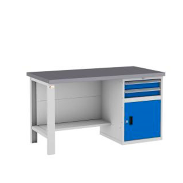 Верстак слесарный однотумбовый . Верстак слесарный Flames серии ВК для средних и тяжелых работ. В зависимости от выполнение работ верстак комплектуется четырьмя видами столешниц: Фанера 40 мм + лак. Фанера 40 мм + кожух из оцинкованной стали 1,5 мм. Фанера 40 мм + окрашенный стальной лист 4,0 мм. Фанера 40 мм + кожух из нержавеющей стали 1,5 мм. Срок службы не менее 10 лет.